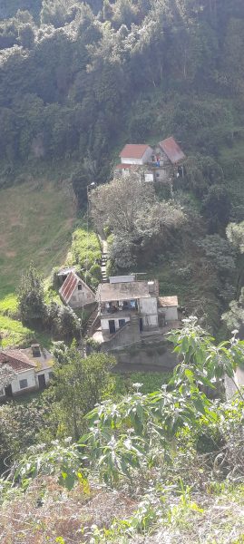 Pour rentrer à Arco Sao Jorge, nous improvisons. La petite route ER219 par Ilha tortille dans la montagne. Très joli parcours mais un peu court (4km). Pour pimenter la course, juste au niveau du miradouro où nous pensions faire une pause, le camion-poubelles bouche la rue et force Dominique à faire une longue marche arrière sur l’étroite route très pentue. Du point de vue, on voit toute la campagne, très construite avec des maisons dispersées, des granges à double-pente formant un angle aigu comme les « chaumières » de Santana. La tôle a remplacé le chaume. Elles sont plus authentiques avec le linge qui sèche et les jardins travaillés à la      main. Une dame passe avec sa faucille. Une très vieille porte son seau. Bien loin du parc thématique !