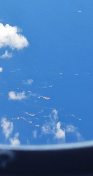 D’après la carte sur l’écran, l’avion survole la Mer des Sargasses. La couverture nuageuse s’est disloquée, je cherche les Sargasses. Malgré l’altitude de croisière – 12.000 m – je les trouve : guirlandes oranges, paquets parfaitement observables de l’avion, les bancs doivent avoir un ordre de grandeur approchant le kilomètre !
