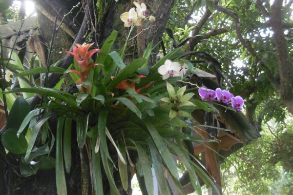 Différentes variétés d’Heliconia, que j’ avais découvertes au Costa Rica. Je me perds et renonce à faire l’énumération des plantes ornementales magnifiques qu’on a l’habitude de voir en pot dans nos maisons. Presque toutes sont étiquetées avec leur nom scientifique en latin. Les plantes sont de provenances diverses : Asie, Amérique Centrale, Australie…je ne sais plus bien comment les classer. De plus on a remplacé les panneaux explicatifs par des QR-codes : manipulation fastidieuse quand le smartphone sert aussi d’appareil-photo. J’abandonne toute velléité botaniste et me laisse fasciner par les formes, les couleurs les associations étonnantes des épiphytes broméliacées et orchidées. C’est une promenade de touriste badaude ordinaire ébahie par tant de beauté et de couleurs. Les flamants roses dans leur enclos et les aras dans leurs volières font un peu zoo, mais c’est si joli !