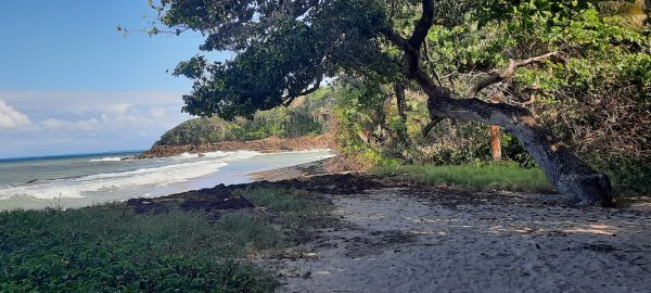A défaut de randonnée, nous cherchons la Plage de l’Anse des Iles qui ressemble à Vinty. Une bande de sable très étroite bordée d’arbres. Le sentier côtier est balisé mais impraticable après quelques centaines de mètres. Des travaux de réhabilitation et de protection ont été effectués. On a replanté des arbres entourés d’un grillage, délimité avec des piquets et des fils de fer un cheminement pour éviter que le piétinement ne dégrade le rivage. Des élèves d’un lycée voisin ont réalisé un panneau signalant qu’on se trouve sur un lieu de ponte des tortues-luths ; ils invite à respecter la tranquillité des tortues. Sympathique initiative.
