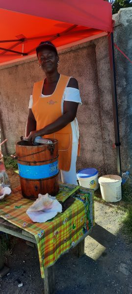 Au coin du chemin suivant, une glacière-vendeuse de sorbets tourne énergiquement le manche de sa sorbetière : un mécanisme métallique avec des ailette fouette le sorbet au coco. Le tout est installé dans un tonnelet en bois qui fait penser à une baratte. Curieuse, j’achète un sorbet, le gobelet le plus petit  3 €. Cette crème glacée fond rapidement à 28°C. la vendeuse est aimable et de très bonne humeur. Je demande la permission de la photographier, elle me répond : « Oui bien sûr, je suis une belle négresse ! » . Nous lui demandons le chemin de la Pointe Allègre. Elle connaît, c’est au bout de la savane des bœufs mais il faut une grosse voiture, nous ne passerons pas avec la Kia Picanto.