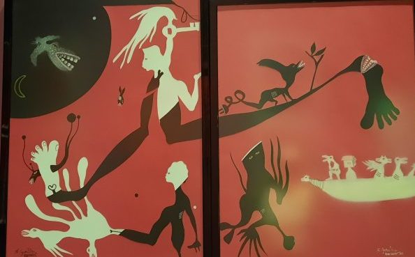 J’ai beaucoup aimé les collages roue/blanc/noir évoquant l’esclavage : hommes découpés, corps étirés, torturés. D’autres œuvres sont très différentes touffues, très colorées rappelant la nature exotique, les couleurs caribéennes avec des jaunes acides bleus turquoise. Images violentes, homme-coq, hommes-chiens avec des dents très visibles. Images violentes.