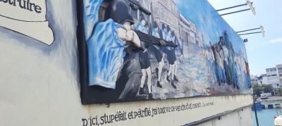 A côté du Steet Art, Baptiste nous montre la ville historique : l’énorme Place de la Victoire, fondée par les Anglais qui ont occupé plusieurs fois la Guadeloupe et développé Pointe à Pitre en rivalité avec Basse Terre, la capitale, alors française avec son grand fort. Arrêt devant une fresque, ou plutôt un bas-relief représentant des manifestants mis en joue par des CRS. Le 25-26 mai 1967, des ouvriers du bâtiments, en grève qui réclamaient 205% d’augmentation, furent réprimés de manière sanglante, à balles réelles, faisant au moins 8 morts (récit de l’Humanité)