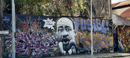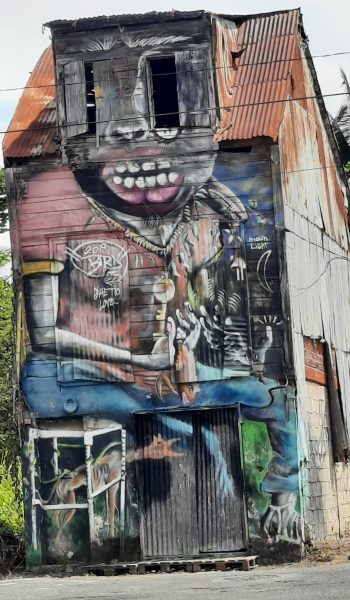 Tout près du musée, quelques blocs tout propres sont décorés en Street Art. La vieille ville de Pointe-à-Pitre, aux maisons coloniales de bois à balcons, est plutôt en ruines. Les graffeurs Street Art se sont emparés de ces murs en deshérence pour donne « de la couleur à la ville ». Je me suis promenée dans le périmètre compris entre le brillant, éblouissant MACTe, la bruyante gare routière (cars orange) et une colline et la rue Raspail enjambée par un pont ancien la Voûte.