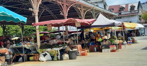 Comme nous sommes en avances je vais faire un tour au Marché des Epices : vanille, cannelle, épices, rhum, punch madras, fruits exotiques. Un très joli marché touristique. Plus touristique que celui de Basse-Terre qui avait aussi des étals de fruits, légumes et d’articles de la vie quotidienne.