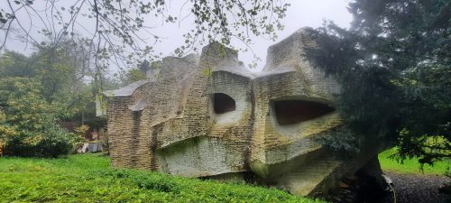 Première étape : la Maison André-Bloc une grande villa bien cachée au creux d’un parc aux camélias roses et bruyères. La villa, habitée, ne se visite pas. Jens a obtenu un rendez-vous exceptionnel pour que nous puissions voir les sculptures-habitacles construite par André Bloc (1951) .