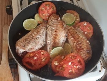 Avec trois tomates et de l’ail achetés en route, on improvise : un filet d’huile je fais revenir les tomates à la poêle puis ajoute les poissons et des rondelles de citrons verts. Excellent !