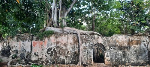 Dernière station de notre « Parcours de l’Esclavage » la prison de Petit Canal, ruinée, dévorée par un figuier maudit (figuier étrangleur). L’arbre englobe les murs à la manière de ceux d’Angkor. Revanche de la nature !