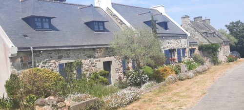 Passant par Crozon, j’achète une barquette de fraises de Plougastel, c’est une véritable addiction ! Après Saint Hernot nous traversons de charmants villages de petites maisons aux volets bleus et pignons triangulaires, enfouies sous les rosiers et les hortensias. A Rostudel, un groupe de maisons mitoyennes pittoresque est à louer.