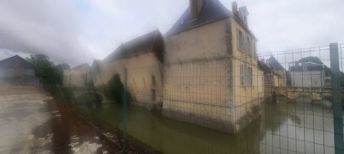 Sur la place du village : un portail monumental d’un château ancien entouré de douves. Passé l’arche, je passe devant un Gite rural  – un gite dans un château c’est chic! puis j’arrive dans la cour d’une grande ferme.