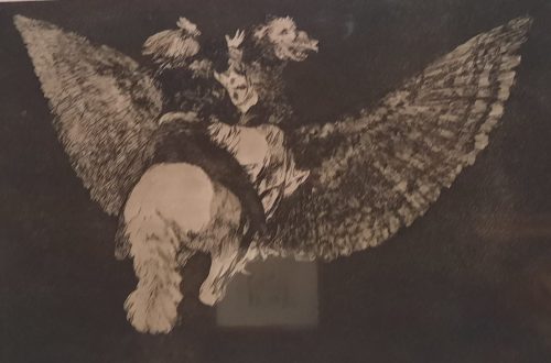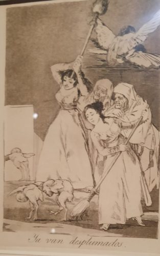Les Caprichos sont conservés dans une pièce noire. Les gravures ne restent pas longtemps dans les vitrines éclairées, six mois tout au plus avant de se « reposer » de longues années. Un professeur est entouré d’étudiants. Je profite de cette visite guidée. Le conférencier insiste sur l’aspect subversif des Caprichos qui critiquent la société espagnole. Gravures au vitriol qu’il publiait lui-même. Quand la protection de Manuel Godoy en 1808 lui fait défaut l’Eglise Catholique et l’Inquisition sont une menace pour les gravures que Goya ne peut plus diffuser et qu’il doit détruire. Il offre les plaques au Roi pour les mettre à l’abri j’ai beaucoup aimé l’humour corrosif, la série des ânes avec leurs litres critiques. J’ai admiré la finesse des figures ? Peut-on parler de caricatures ? Malheureusement l’assistance est nombreuse et j’ai peu de temps pour avoir un peu d’intimité avec les œuvres.