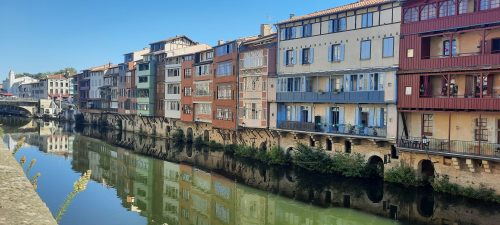 Si Albi est une ville rouge, de briques, de construction homogène, Castres est plutôt blanche camaïeu de gris et de beige, belle pierre calcaire pour les demeures bourgeoises. Beau jardin Le Nôtre, avec un théâtre rococo à l’italienne blanc de stuc comme une pâtisserie. Au fond du jardin le classique Palais épiscopal dessiné par Mansart en pierre blonde loge l’Hôtel de Ville et le Musée Goya. Un peu plus lion une balustrade longe l’Agout dont l’autre rive est bordée d’un alignement de maisons colorées aux balcons de bois à encorbellement : anciennes maisons des tisserands, tanneurs et teinturiers qui s’ouvrent directement sur la rivière.