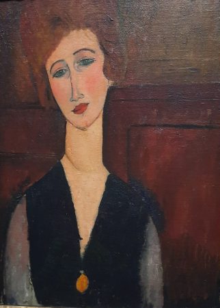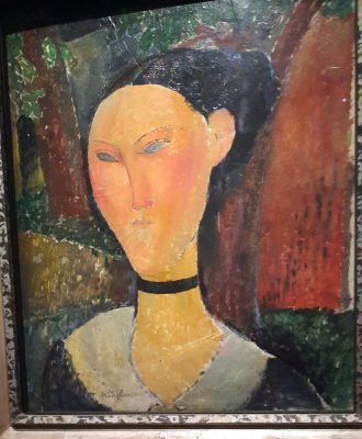 Modigliani peintre renommé était aussi sculpteur.(1911 à 1913) Comme Picasso, Apollinaire Picasso…, la découverte de la sculpture africaine et des masques exerce une fascination sur les plasticiens. La stylisation des visages rappelle les masques . Face aux têtes sculptées et aux masques africains on a accroché une série de portraits peints en 1915 : l’Enfant Gras, Lela de Valence (presque cubique) La Femme au ruban de velours