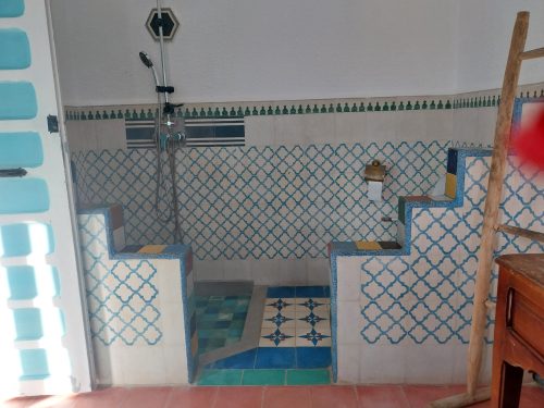 La maison d’hôtes est située sur une colline rocailleuse dominant la mer. Une maison blanche aux volets bleus est construite autour d’un patio planté d’une végétation luxuriante. Chaque chambre est meublée d’objets anciens provenant d’un brocanteur. Lits et tables en beau bois marqueté. Le travail du bois de thuya est une spécialité d’Essaouira. Chambre et salle de bains sont carrelés dans un camaïeu de bleu avec des zelliges et des carreaux mats à motifs géométriques. Les tableaux sont l’œuvre de Corente, notre hôte. Des photos anciennes complètent la décoration (portrait de Fidel Castro en Net B).