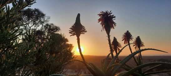 Devant la maison, la terrasse est pavée de galets noirs et blancs aux motifs arrondis autour des massifs fleuris : jaune du Senna bicapsularis, accompagné d’un hibiscus rouge et de petites plantes grasses épineuses Aloe brevifolia. Un autre massif rassemble autour d’un faux poivrier Schinus molle des aloès en fleur Aloe arborescens. Je me régale d’identifier genre et espèces de plantes avec Plantnet sur mon téléphone.
