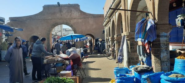 Retour de Bab Doukala par la grande rue qui coupe en deux la ville close tout d’abord occupée par des commerces destinés aux habitants de la ville : vêtements, droguerie, légumes et fruits frais . Elle traverse le Souk Jedid , marché qui s’organise en deux patios, l’un d’eux avec les poissons et les épices, le second symétrique.