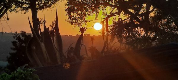 Coucher du soleil splendide qui irradie derrière le petit arganier.