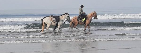 Comme le petit déjeuner était très copieux et qu’un couscous nous attend au dîner, nous avons sauté le déjeuner et je suis repartie, après une courte pause, arpenter le sable de la belle plage. La mer est montée et a effacé les terrains de foot, les enfants sont repartis à la maison. La promenade est très tranquille. Dans l’eau, un père donne un cours de surf à son gamin. Un peu plus loin, une femme en peignoir, attend son mari. De rares piétons marchent. Des chevaux galopent. Ils sont magnifiques. Certains sont libres, d’autres chevauchés par des cavaliers, me font penser à la fantasia de la fresque. Les dromadaires, menés par le chamelier à pied, sont montés par des séniors européens, un peu ridicules, ressemblant aux enfants sur les ânes de La Muette ou du Luxembourg.