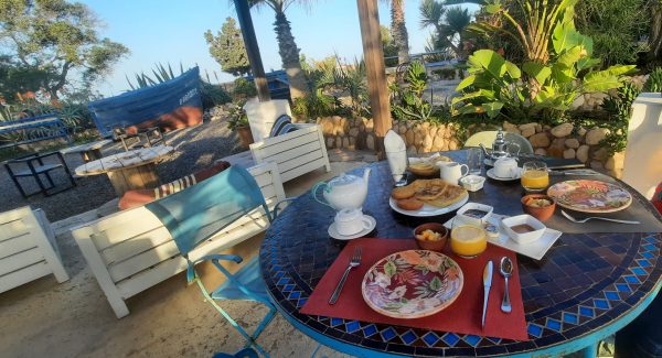 Petit déjeuner idéal au soleil sur la terrasse : crêpes feuilletées repliées en carré, deux beignets, jus d’orange frais, omelette, salade de fruits, mile et confiture. Tellement abondant qu’il faudra sacrifier les sardines de midi.