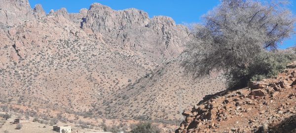 A la sortie de la ville, route d’Agadir. Nous passons devant Tandilt où nous avions logé autrefois. A notre droite un massif granitique, le djebel Lkest culmine à 2374 m au dessus de Tafraout, surnommé La Tête de Lion.