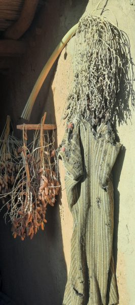 L’été on dormait sur la terrasse. Un voile protégeait les dormeurs de « coups de lune » ; le guide affirme que la lune fait saigner du nez. On faisait également sécher sur la terrasse les légumes et les dattes. Tout était conservé même les noyaux de datte qui favorisaient la conservation des restes de soupe ou des plats de la veille. Dans un coin, un abri pour le métier à tisser loin de l’agitation de la maison. La terrasse était l’espace des femmes. On y faisait également monter les invités pour montrer aux voisins qu’on recevait du monde, signe d’ouverture et de prospérité de la famille.