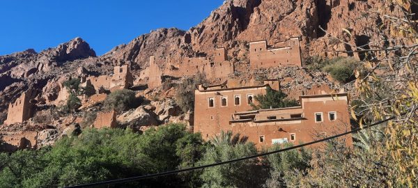 Après le village d’Oumesnat, le haut minaret d’une mosquée monumentale dépasse du paysage. Un peu plus loin, un hôtel, tout aussi monumental loge le bureau des guides. Dans la Vallée des Ammeln, on voit grand : les maisons neuves peintes en rose, ont deux, parfois trois étages tandis que les maisons traditionnelles tombent en ruine.