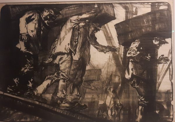 Au 2ème étage deux peintres sont mis à l’honneur : Le peintre britannique Albert de Belleroche (1864-1844) ami de Toulouse-Lautrec, Renoir, Degas. Ses « femmes décoiffées » selon Renoir, ne m’ont pas impressionnée mais j’ai gardé la photo de l’Enterrement de Zola puisque je suis en train de lire Le Docteur Pascal dernier épisode de la série des Rougon-Macquart. En revanche j’ai beaucoup aimé les dessins et gravures de Frank Brangwyn(1867-1956) surtout quand il dessine les hommes au travail, dockers ou halant un bateau. Comme d’autres artistes du mouvement Arts and Crafts, Brangwyn s’est intéressé aux arts décoratifs. De beaux meubles marquetés ainsi que des céramiques de facture épurée accompagnent les tableaux. J’ai aussi remarqué une gravure d’un bateau échoué et une vue en Noir et blanc de Venise m’a plu. J’adore ces découvertes de peintres au hasard de musées de province.