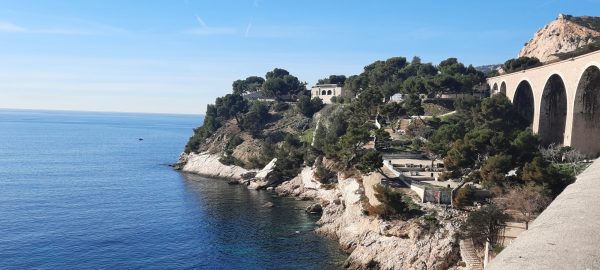 Nous sortons de l’Estaque par la route D5 vers l’Ouest en dessous des grandes arcades de la voie de chemin de fer – petit TER bleu qui me fait rêver. Arrêt au-dessus des plages des Corbières accessibles par des marches. Des gens se baignent mais je n’ai pas le courage de descendre pour remonter tout de suite.