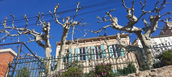 Pas un nuage, soleil radieux. Les amandiers en fleur se détachent sur le ciel bleu.