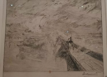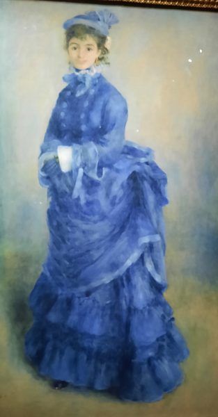 200 œuvres sont accrochées sans jury ni marchands sur des murs tapissés de rouge. Deux grands Renoir nous accueillent : une grand danseuse et La Parisienne. 31 artistes exposent ici des œuvres très variées, grande peinture comme celles de Renoir, eaux fortes de Braquemond avec des portraits comme celui de Théophile Gautier, une amusante pie « Margot-la-critique » et une Locomotive d’après Turner qui m’a bien plu.