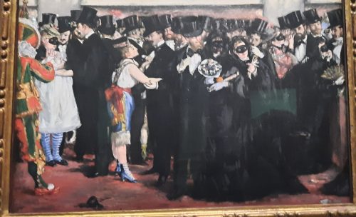 le tableau de De Nittis est tout à fait charmant mais le tableau de Manet, Le Chemin de Fer exposé à côté lui a « fait ombrage », on a moqué le Manet. le Bal à l’Opéra de Manet, lui, a été carrément refusé sans doute à cause du sujet : dans le foyer de l’Opéra les transactions entre les prostituées et leurs clients ont choqué le public bien-pensant. Mallarmé s’en est indigné dans un article.