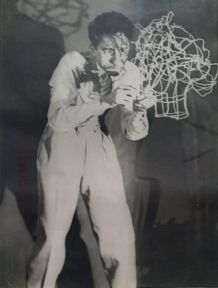 Deux photographies bord à bord  donnent l’étendue des domaines : un montage surréaliste et un portrait de Cocteau en habit d’académicien, un monde les séparent…. Poète, cinéaste, homme de théâtre, écrivain. Impossible de le définir. Génial touche-à-tout, il a  fréquenté des artistes si variés.  Les musiciens du Groupe des Six (Honegger, Darius Milhaud, Poulenc, Germaine Taillefer, Auric, Durey) , des danseurs et ballets russes (il a collaboré avec Picasso pour la pièce Parade), ami des poètes et écrivains.