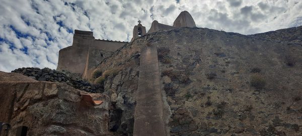 Après la fontaine la pente est moins rude. Je suis le balisage jaune et bleu et arrive presque au niveau de la mer dans un lotissement de maisons neuves avec piscines : Carbunghja, pas palpitant ! Il faut alors remonter tout ce que j’ai descendu, au début sur le goudron, c’est rude. Etrangement, quand la route devient piste puis sentier, même avec une pente plus raide, c’est plus facile. Je gagne la petite chapelle blanche cubique Pierre et Paul dans un virage à l’entrée de Corbara. Le sentier s’élève droit vers le sommet du village, passe devant la grande maison blanche avec son pigeonnier, un palazzo, un sentier plat me conduit ensuite dans des ruelles entre les maisons accrochées à la pente. Enfin un escalier va à la Chapelle des Sept douleurs qui se dresse à contre-jour presque noire sur un ciel pommelé. Fermée. Le sentier de crête va aux ruines du Château Guido. Je croyais que l’imposante construction face à notre gîte que je dessine chaque matin, où Paoli, furieux de n’avoir pas pu prendre Algajola, avait décidé la fondation de l’Île Rousse était le Château Guido. Pads du tout. Les ruines sont au sommet d’une autre colline, au-dessus de l’impressionnante A Nunziata qui s’impose dans le paysage.