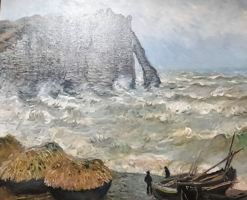 La confrontation entre les photographies et les peintures impressionniste est détonante. La Cathédrale de Rouen de Monet est accrochée au milieu de plusieurs photographies dont une de John Ruskin. Dès le milieu du XIXème siècle, sous l’impulsion de Prosper Mérimée qui a initié l’Inventaire des Monuments Historiques dès 1831, les photographes ont pris pour sujet les monuments. Il est possible que des peintres se soient inspirés de ces photographies. Jongkind a peint un tableau correspondant parfaitement à la photographie exposée à côté. Parmi les nombreuses photos sont exposés les tableaux de Boudin, Monet et Courbet qui répondent aux images des mêmes sites. Cette confrontation est passionnante.