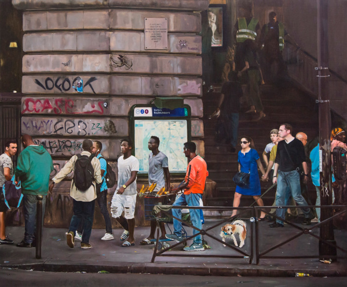 A l’étage, l’exposition est beaucoup plus fournie. Diverses œuvres évoquent plutôt des histoires personnelles de migrants, d’exils, d’errance ou de solitudes. Tableaux comme Rive Droite hyper-réaliste ou gravures, photos. Dans le Studio Rex des photos tentent de donner une présence et sortir de l’ombre ces hommes et ces femmes souvent sans-papiers, sans-droits