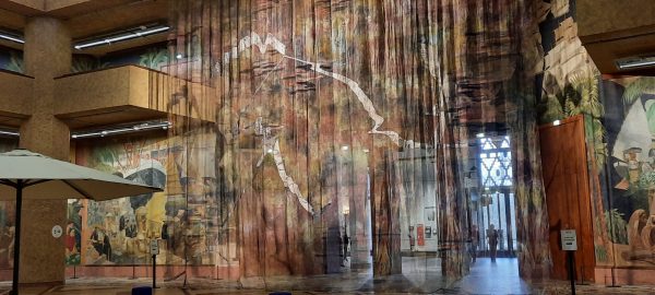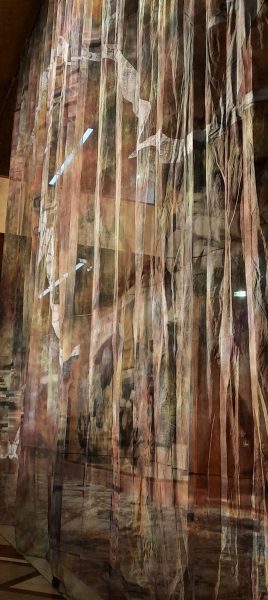 Masquant l’entrée de la Salle du Forum, Amalia Laurent, a suspendu un immense voilage teinté qui joue les effets de transparence et de lumière, l’œuvre, A l’usage des fantômes , dansée sur la musique d’un gamelan javanais, se place à la limite du réel et des mondes parallèles. On devine, déformées les fresques, couleurs illisibles. Les fresques vantant l’action des colonisateurs et l’extraction coloniale des richesses de la natures se trouvent atténuées, brouillées par le voile. Il ne s’&git pas de détruire ou de faire disparaître l’héritage d’une période historique douloureuse mais d’ajouter un élément…