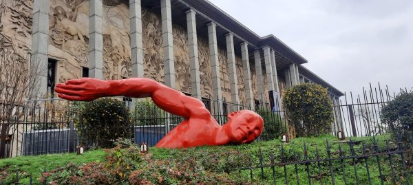Le nageur rouge… « Dans le Bonheur« CLIC qui accueille les visiteurs émergeant des buissons dans un crawl puissant, donne le ton. Sa couleur rouge transcende les couleurs de peau, il peut évoquer aussi l’émigration par la mer, dans les pirogues – l’artiste Djadji Diop est sénégalais.