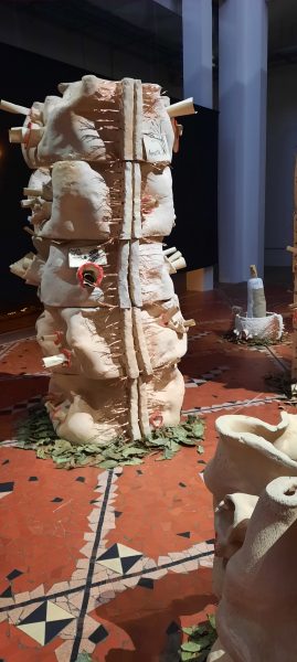 Fantômes encore! L’artiste togolais, Kokou Ferdinand Makouvia, assailli d’étranges vibrations provenant d’une foule emprisonnée dans le Palais a inventé un rituel de purification pour apaiser ces présences. Il a confectionné d’étranges vases d’argile, cousus de fils de cuivre, dans lesquels des tubes sont destinés à recueillir les messages des visiteurs. Au pied des sculptures sont répandues des feuilles de Kpatima. Les messages sont brûlés, leurs cendres recueillies sont utilisées pour faire l’encre a disposition des visiteurs suivants….