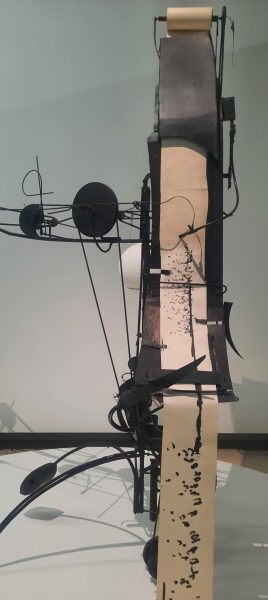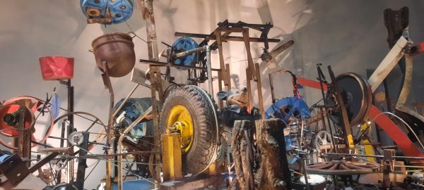Mieux qu’un mobile qui oscille au vent Tinguely a construit des machines capables de se déplacer, de rouler sur les innombrables roues, de bringuebaler dans un bruit de ferraille. Sculpture cinétique bruyante.