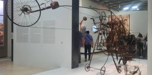 L’exposition du Grand Palais présente ces machines de Tinguely animées pendant quelques secondes. Il suffit d’attendre . Certaines se mettent en marche à grand fracas comme le Bal des pauvres où casseroles et gamelles s’entrechoquent et où la jambe du mannequin ne déhanche. Au mouvement s’ajoute le bruit qui deviendra carrément infernal sur des machines plus volumineuses pour finir avec cet Enfer