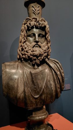 La première partie de l’exposition est archéologique avec des objets originaux : un vase en forme de canard m’a bien plu, des bagues et sceaux, et toute une collection numismatique avec des pièce à l’effigie de Cléopâtre qui ne ressemble pas du tout à Liz Taylor, ne porte pas de perruque de pharaon mais dont le nez fameux est bien marqué. La dynastie des Ptolémées est d’origine macédonienne et l’Egypte est très hellénisée : des statuettes montrent les dieux égyptiens très différents de ceux du Nouvel Empire. On reconnait Isis, Osiris, Horus, et Bès. Photographies anciennes de Denderah, temple hellénistique. Et même une réplique de la Pierre de Rosette