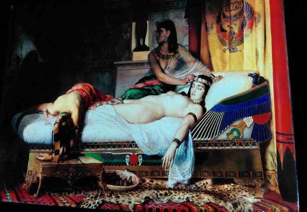 Cléopâtre voit le jour à Alexandrie en 69 av. JC et se suicide par une piqûre de serpent en 30 av JC après la bataille d’Actium. Cléopâtre VII, reine intelligente, fine diplomate a restauré le lustre que son royaume avait perdu, devenant protectorat romain. Elle noue des liens avec César dont elle a un fils Césarion (Ptolémée XV), le suit à Rome en 46. Après l’assassinat de César, elle va négocier avec Marc Antoine , accroit ses territoires, modernise sa flotte. ils auront ont 3 enfants. Vaincue à la bataille d’Actium, elle préfère se suicider que de se soumettre à Octave.