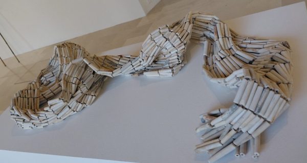La médiatrice me conduit à l’installation Ocean’s Lament. Aucune explication, elle me conseille de respirer, sentir l’odeur qui se dégage, puis de deviner l’origine de ces petits tubes crème montés somme les perles d’un improbable collier. Ce sont les tubes de pipes des marins provenant de la vase de la Tamise. J’ai déjà lu quelque chose sur les trouvailles dans les sédiments de la rivière à Londres. Combien de tubes? combien de pipes? combien de marins? de voyages transatlantiques? Cette matière première fait rêver et se relie au titre « Des océans et des ombres »