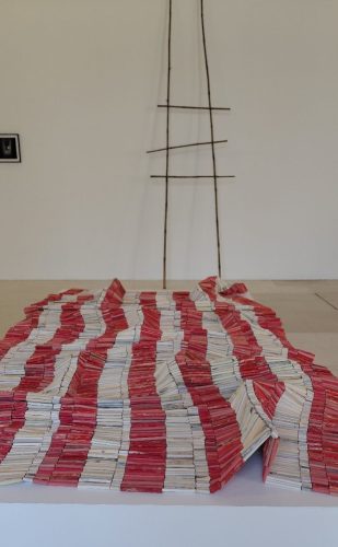Une sorte de tapis tissé de cylindres rouge et blancs évoque clairement les bandes du drapeau étatsunien. Ce n’est pas un hasard. Nadia Myre est canadienne et algonquine; ses œuvres mettent en évidence les mémoires et les héritages coloniaux. les cylindres sont en céramique fabriqués par l’artiste elle-même