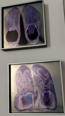 les douze photos carrés au même motif m’interpellent : de loin je crois voir des radiographies de poumons . Quand je m’approche j’ai la surprise de découvrir des mocassins, des chaussons d’enfant sagement rangés par paire; la médiatrice m’explique qu’ils ont été trouvés dans une institution où sont morts de nombreux enfants enlevés à leurs parents autochtones pour être élevés par des soeurs. Histoire poignante de ces enfants enlevés, acculturés, puis décédés.