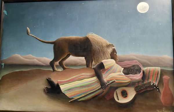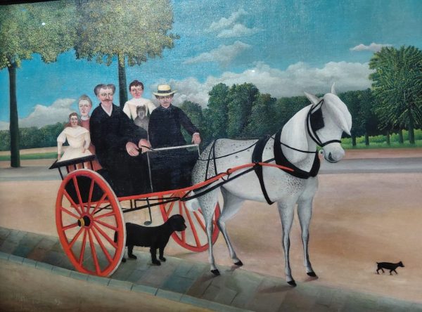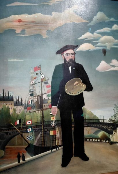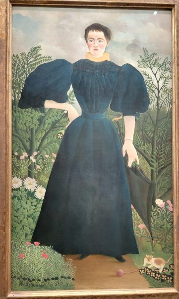 Avant d’aborder ses tableaux les plus connus comme la Charmeuse de Serpents ou La Guerre qu’on ne présente plus, l’exposition présente des petits formats, souvent des portraits. Rousseau se voulait peintre, vendre des portraits lui permettait de vendre. Il a inventé le concept de « portrait-paysage » où le sujet se trouve dans un environnement fleuri (remarquer le petit chat plein de fantaisie)