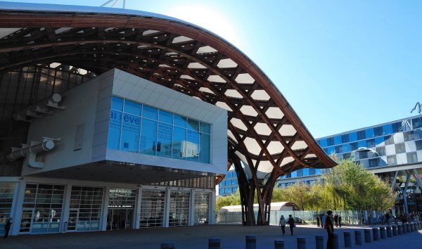 Coiffé d’un toit alvéolé inspiré d’un chapeau chinois en bambou, c’est l’oeuvre de Shigeru Ban et de Jean de Gastine. léger, aérien presqueavec les lamelles de bois collées reposant sur des piliers aérés.