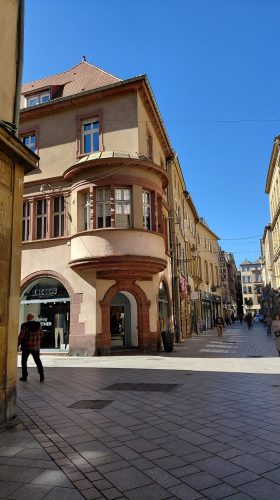 J’aime beaucoup découvrir une ville à pied, avec la carte du livret Un Grand Week-end à Metz Hachette qui propose une dizaine de promenades avec des plans. La toponymie est pittoresque : certaines rues sont notées « En » Nicolairue, avec le rue à la fin, comme En Fournirue (rue des Fournils) ou En Chaplerue (chapeliers?), en Chandellrue(chandelles?), En Nexierue (????).