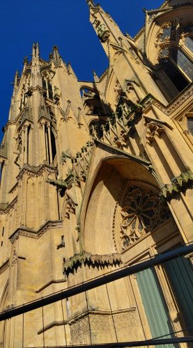 En prenant pour cap, la Cathédrale nous passons par la Place d’Armes avec ses deux trophées (monumentaux) et arrivons au coeur de ville. La Cathédrale est fermée depuis quelques minutes. Ce n’est pas grave, nous avons vu les vitraux de Chagall à notre précédente visite en 2021. Nous nous attablons à une terrasse plein soleil en face du marché couvert (fermé également le soir) : construction très élégante en U commencé en 1785 pour être le Palais épicsopal transformé en marché en 1831.