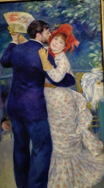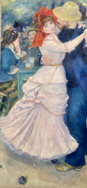 le tableau à l’honneur est le Moulin de la Galette avec beaucop d’explications et encore un banc pour prendre son temps à découvrir les personnages assis au premier plan, les couples, les lumières. Les taches claires de lumière sur les robes des femmes, sur les bancs et les dossiers, au sol semblent la marque de fabrique de Renoir.